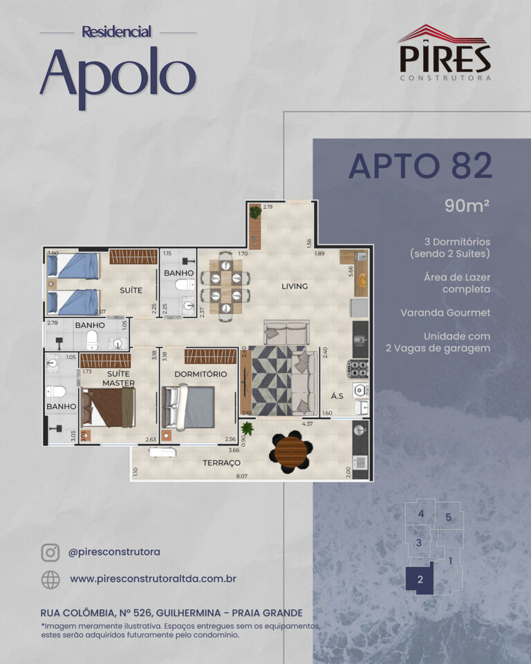 Apartamentos de 3 dormitório, varanda gourmet, 2 suítes, opções de planta de 90 a 101 m² de área útil, com duas vagas de garagem demarcadas.