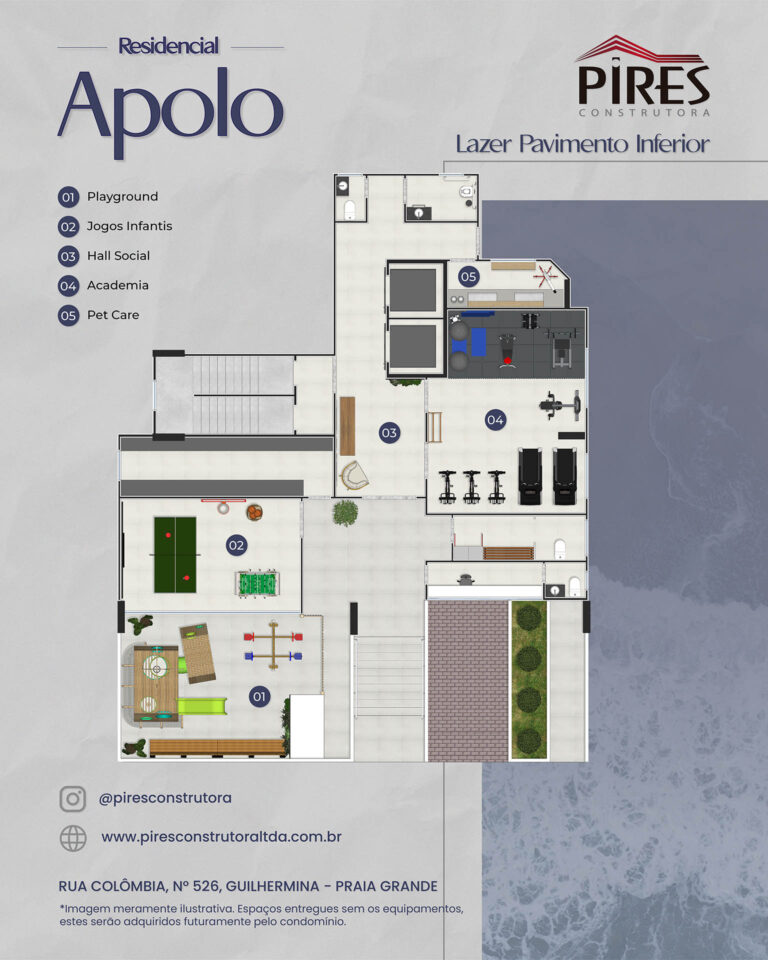 Área de lazer no térreo: academia, pet care, salão de jogos infantil e playground descoberto.