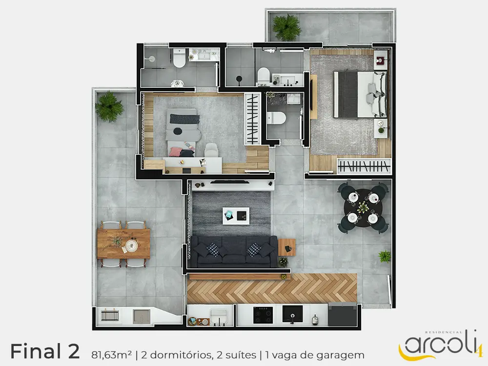 Apartamentos de 2 dormitórios, com uma ou duas suítes, metragens de 67m² a 81m².